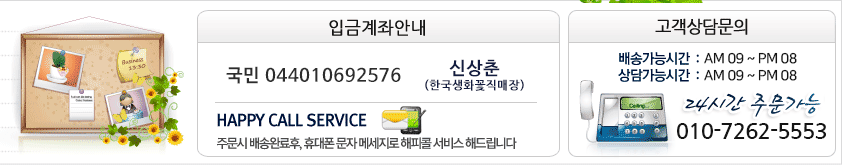 주소 : 서울 강북구 도봉로98길 36 한국생화꽃직매장 | 대표자 : 신상춘 사업자등록번호 : 217-90-27739 통신판매업신고번호 : 제2025-서울강북-0644호 문의전화 : 010-7262-5553 | 팩스 : 02-998-5060 | E-MAIL : bgns33@naver.com |
